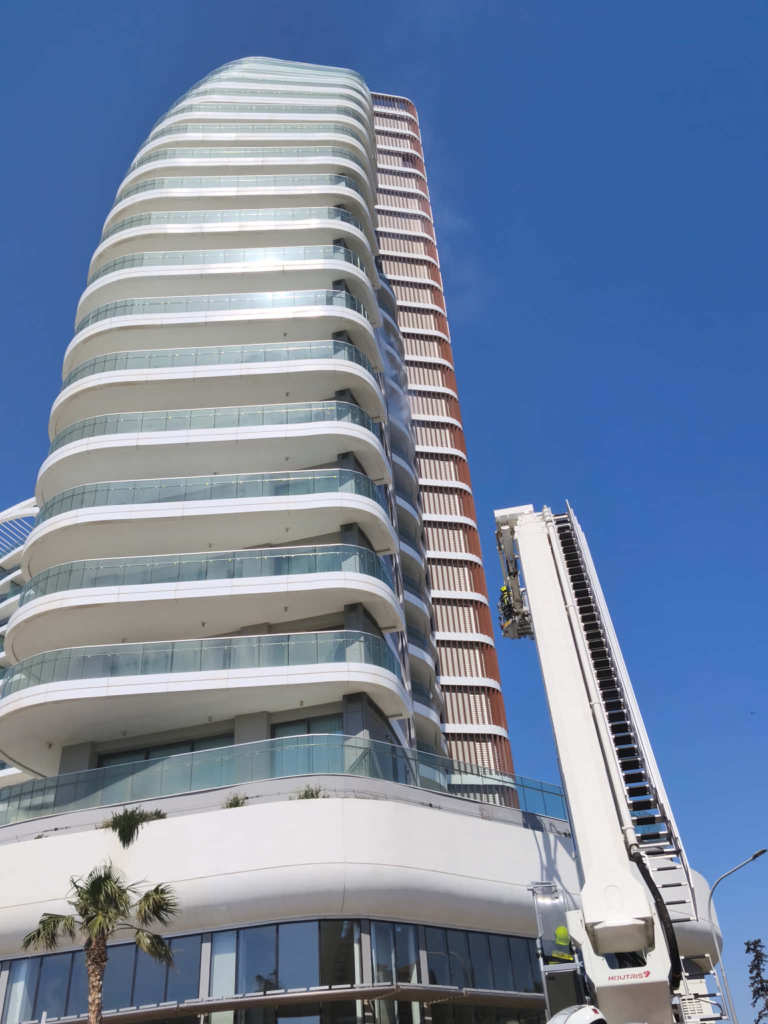 The exercise is taking place at the 27-storey Limassol Delmar tower at 117-123 Georgiou A’ Street in Germasogeia, with units from the Agios Nikolaos Fire Station responding to a simulated emergency.